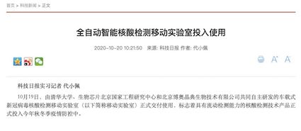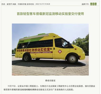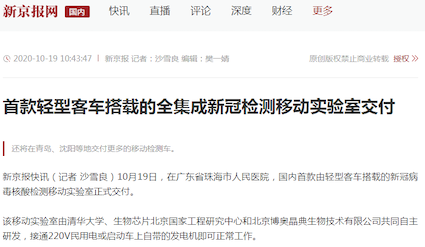 10月19日,“珠海市核酸檢測基地”在廣東省珠海市人民醫(yī)院正式揭牌啟用。揭牌儀式上,由清華大學、生物芯片北京國家工程研究中心和北京博奧晶典生物技術有限公司共同自主研發(fā)的首款輕型客車搭載的全集成新冠檢測移動實驗室正式亮相。
