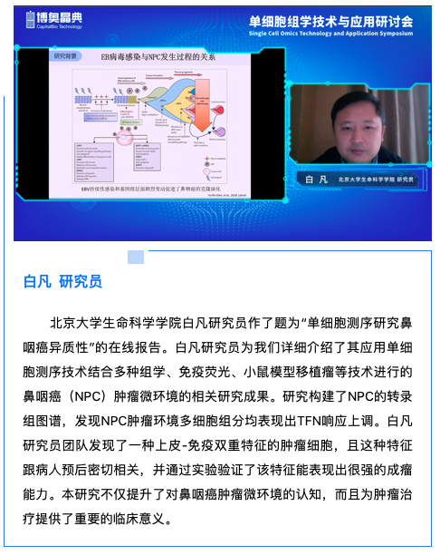2020年10月31日,由生物芯片北京國家工程研究中心、北京博奧晶典生物技術(shù)有限公司主辦的“單細(xì)胞組學(xué)技術(shù)與應(yīng)用研討會”在北京成功舉辦。在疫情防控新形勢下,本次大會以線下現(xiàn)場會議與線上遠(yuǎn)程會議相結(jié)合的形式舉辦,打破時(shí)空及地域限制,以更寬更廣的交流平臺,讓全國各地的單細(xì)胞領(lǐng)域?qū)<覍W(xué)者共同見證本次大會的精彩瞬間。本次會議線上累計(jì)直播瀏覽量超6000人次,線下100余位嘉賓出席。會議特采用專業(yè)級演播大廳進(jìn)行直播報(bào)告,通過5G+4K+AR的創(chuàng)新技術(shù)和高品質(zhì)傳輸進(jìn)行全程實(shí)時(shí)直播,為現(xiàn)場及遠(yuǎn)程參會代表帶來極好的視聽體驗(yàn)。