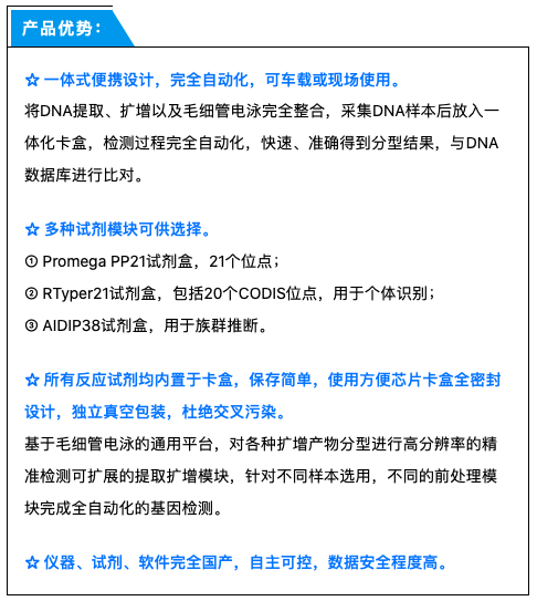 該系統(tǒng)基于微流控芯片技術(shù),配套全集成芯片卡盒和數(shù)據(jù)分析軟件,集DNA提取、PCR擴(kuò)增、毛細(xì)管電泳于一體,自動生成分型結(jié)果,2小時即可獲得DNA分型。既可用于重大事故、自然災(zāi)害的人員身份快速識別和案件現(xiàn)場檢材的快檢快篩,也可用于邊防、公安等基層機(jī)關(guān)對敏感、可疑人員身份的快速識別和排查。儀器操作簡單便捷,無需專業(yè)技術(shù)人員操作,可檢測的樣本包括:血卡、唾液卡、口腔拭子卡等。無使用環(huán)境要求,既可在實(shí)驗(yàn)室、辦公室、窗口單位,也可與警用現(xiàn)勘車配套移動式檢測,具有良好的抗震性、防污染措施,使用無需校準(zhǔn)。同時兼容多款國內(nèi)外DNA試劑,具備個體識別和族群推斷功能。
