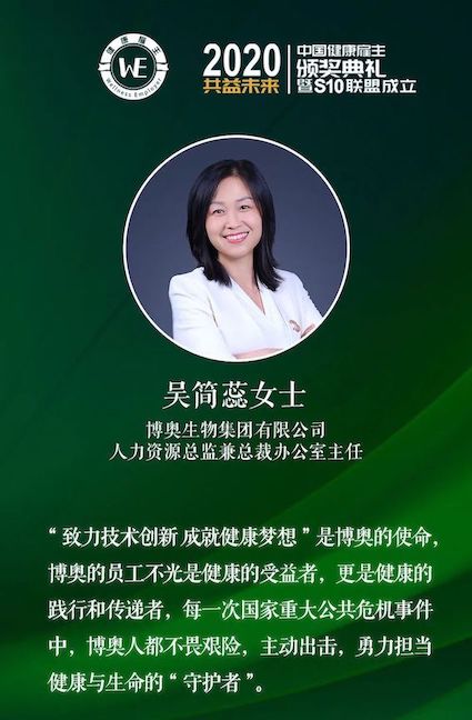 12月18日,由中國人力資源管理研究會攜手聯(lián)合國契約組織國際WELL建筑研究院、太極禪、世界可持續(xù)發(fā)展領導力組織、上海市著名外企工會聯(lián)合會及中智上海技術經(jīng)濟技術合作有限公司等機構(gòu)共同舉辦的第四屆(2020年)中國最佳健康雇主評選在上海揭曉。博奧生物集團憑借抗疫期間的卓越貢獻,斬獲“抗疫先鋒獎”并蟬聯(lián)“中國十佳健康雇主”。