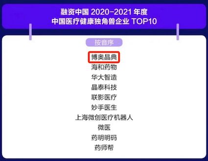 本次評選中獲得2020-2021年度中國醫(yī)療健康獨角獸企業(yè)TOP10的榮譽,進一步力證了博奧晶典在生命科學領域的發(fā)展?jié)摿Γ苍俅物@示了業(yè)界對博奧晶典的關注與肯定。