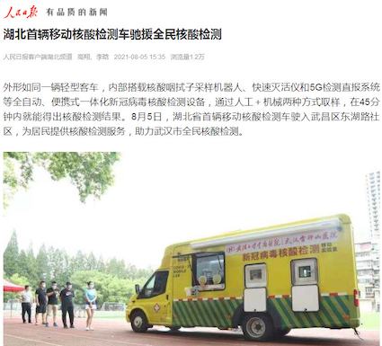 作為科技抗疫的標志性成果,新冠病毒核酸檢測移動實驗室可以讓核酸檢測更加準確便捷,安全快速,接通220V民用電或啟動車上自帶的發(fā)電機即可正常工作,采樣可通過口咽拭子采樣機械臂和人工兩種方式完成。其裝載的全集成芯片實驗室系統(tǒng)45分鐘即可完成全程實驗,最快35分鐘報告陽性結(jié)果,檢測靈敏度可達150拷貝/毫升。如此出色的性能使其特別適合在社區(qū)發(fā)生聚集性疫情和縣鄉(xiāng)村等醫(yī)療條件相對較差的場景下發(fā)揮優(yōu)勢。在為市民完成檢測后,檢測結(jié)果會通過5G通信系統(tǒng)實時上傳到醫(yī)院的核酸檢測實驗室,經(jīng)過審核后上報武漢市衛(wèi)健委的核酸檢測系統(tǒng)?!拜p騎兵”每天可以完成近800份樣品的檢測,為武漢市全民核酸檢測提供有力支持,在此次武漢疫情中發(fā)揮了積極作用。