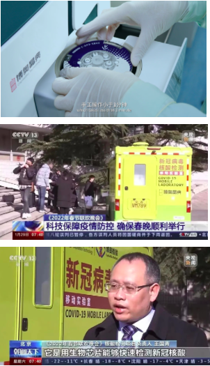 在2021、2022年央視春晚疫情防控工作中,以及2022年冬奧會(huì)開幕倒計(jì)時(shí)100天主題活動(dòng)等重大活動(dòng)中,“輕騎兵”均發(fā)揮了重要作用。這抹備受矚目的“晶典黃”是國內(nèi)首臺(tái)集采集和檢測(cè)為一體的移動(dòng)式新冠病毒檢測(cè)實(shí)驗(yàn)室,裝載基于全新一代先進(jìn)的芯片實(shí)驗(yàn)室(Lab-on-a-chip)設(shè)計(jì)理念,檢測(cè)時(shí)僅需將樣本保存液加入芯片,封閉芯片后即可上機(jī),手工操作小于1分鐘。生物反應(yīng)全程(包括核酸提取、核酸純化、擴(kuò)增反應(yīng)、核酸檢測(cè)和結(jié)果判讀等)均集成在一個(gè)整體密閉、內(nèi)部分區(qū)的微流控芯片內(nèi),由全自動(dòng)核酸分析儀完成,因此無需專業(yè)分區(qū)實(shí)驗(yàn)室,無需人工干預(yù),最大程度降低操作人員感染及樣本間交叉污染的風(fēng)險(xiǎn)。