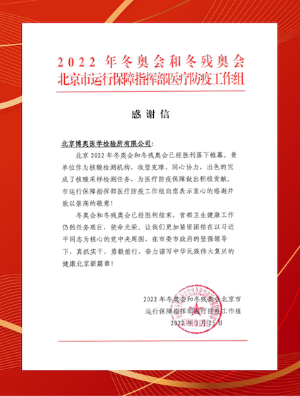 無悔擔當 冬奧有我丨北京博奧醫(yī)學檢驗所收獲北京冬奧感謝信!