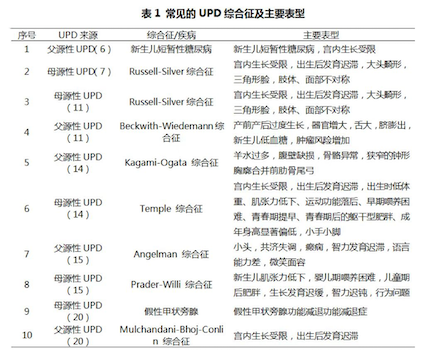 大多數染色體UPD沒有臨床表型,當UPD發(fā)生在印記基因區(qū)域則會導致印記基因異常,出現(xiàn)異常的表型。目前針對上述UPD綜合征(表1)尚無有效的治療手段,因此,早發(fā)現(xiàn)、早診斷、早干預對于此類疾病的防控尤為重要。