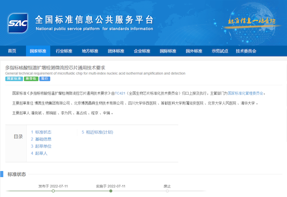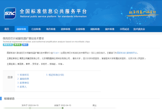 近日,國家市場監(jiān)督管理總局、國家標(biāo)準(zhǔn)化管理委員會發(fā)布《中華人民共和國國家標(biāo)準(zhǔn)公告》2022年第6號和第8號,由博奧生物集團(tuán)有限公司主導(dǎo)制定的國家標(biāo)準(zhǔn)《微流控芯片核酸恒溫?cái)U(kuò)增儀技術(shù)要求》(GB/T 41407-2022),《多指標(biāo)核酸恒溫?cái)U(kuò)增檢測微流控芯片通用技術(shù)要求》(GB/T 41521-2022)獲準(zhǔn)頒布,分別于2022年4月15日、2022年7月11日起正式實(shí)施。兩項(xiàng)新標(biāo)準(zhǔn)的頒布完善了我國核酸擴(kuò)增檢測技術(shù)領(lǐng)域的標(biāo)準(zhǔn)內(nèi)容,使相關(guān)技術(shù)所涉及產(chǎn)品應(yīng)用與服務(wù)更加規(guī)范、具有較強(qiáng)的指導(dǎo)性。