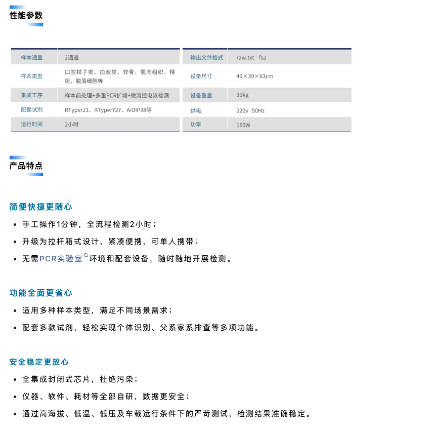該設(shè)備采用拉桿箱式設(shè)計,可由單人攜帶使用,適用于戶外、車載、高原環(huán)境等,是國際首款“可移動法醫(yī)DNA實驗室”,為全球公共安全部門在現(xiàn)場物證檢驗,重點人員篩查、重大公共安全事件的快速處置、出入境邊防檢查等應(yīng)用場景增添強(qiáng)勁利器。